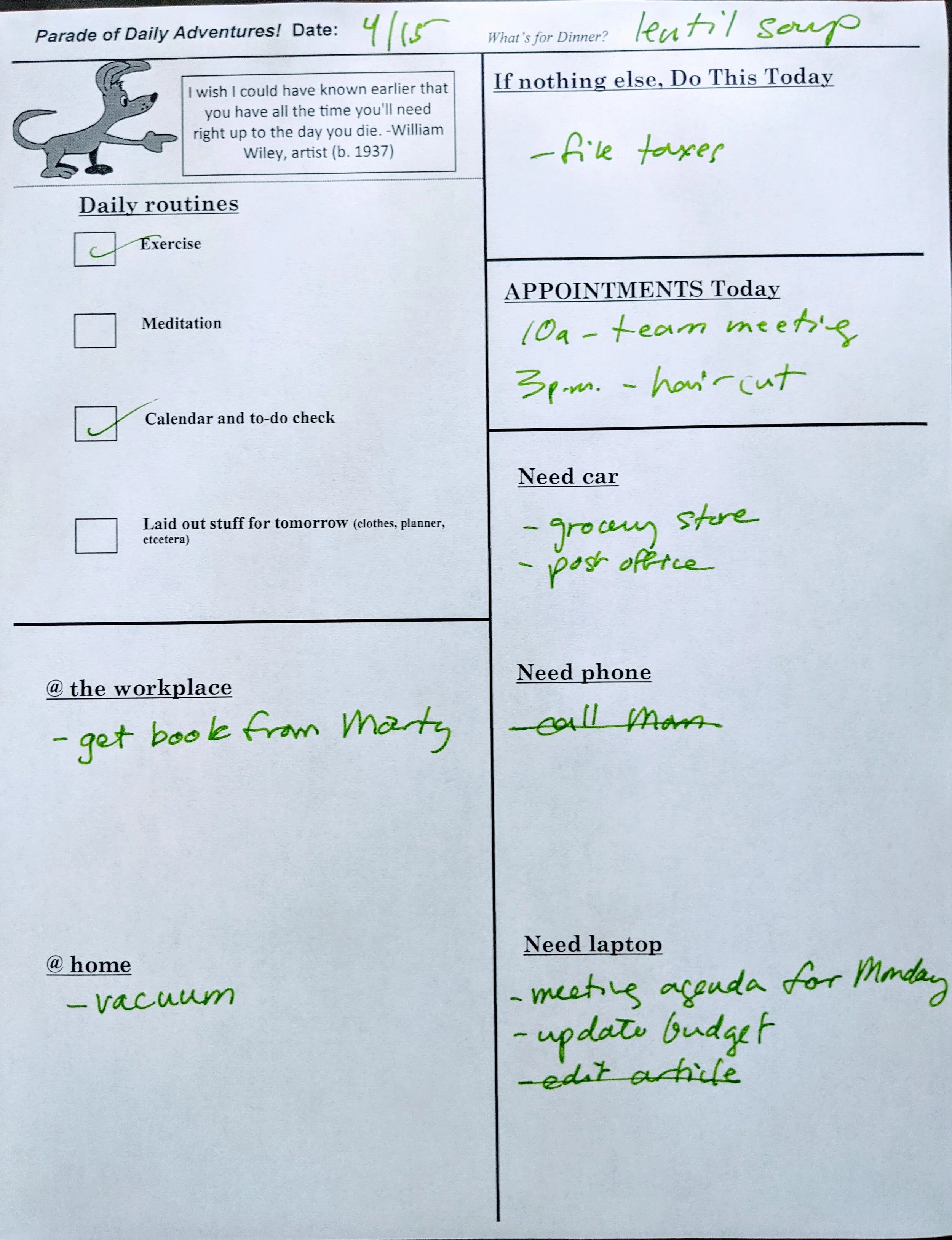 Also, your interests and needs evolve. The nice thing about handwriting your daily list is that you can change things up any time without having to learn a whole new app.