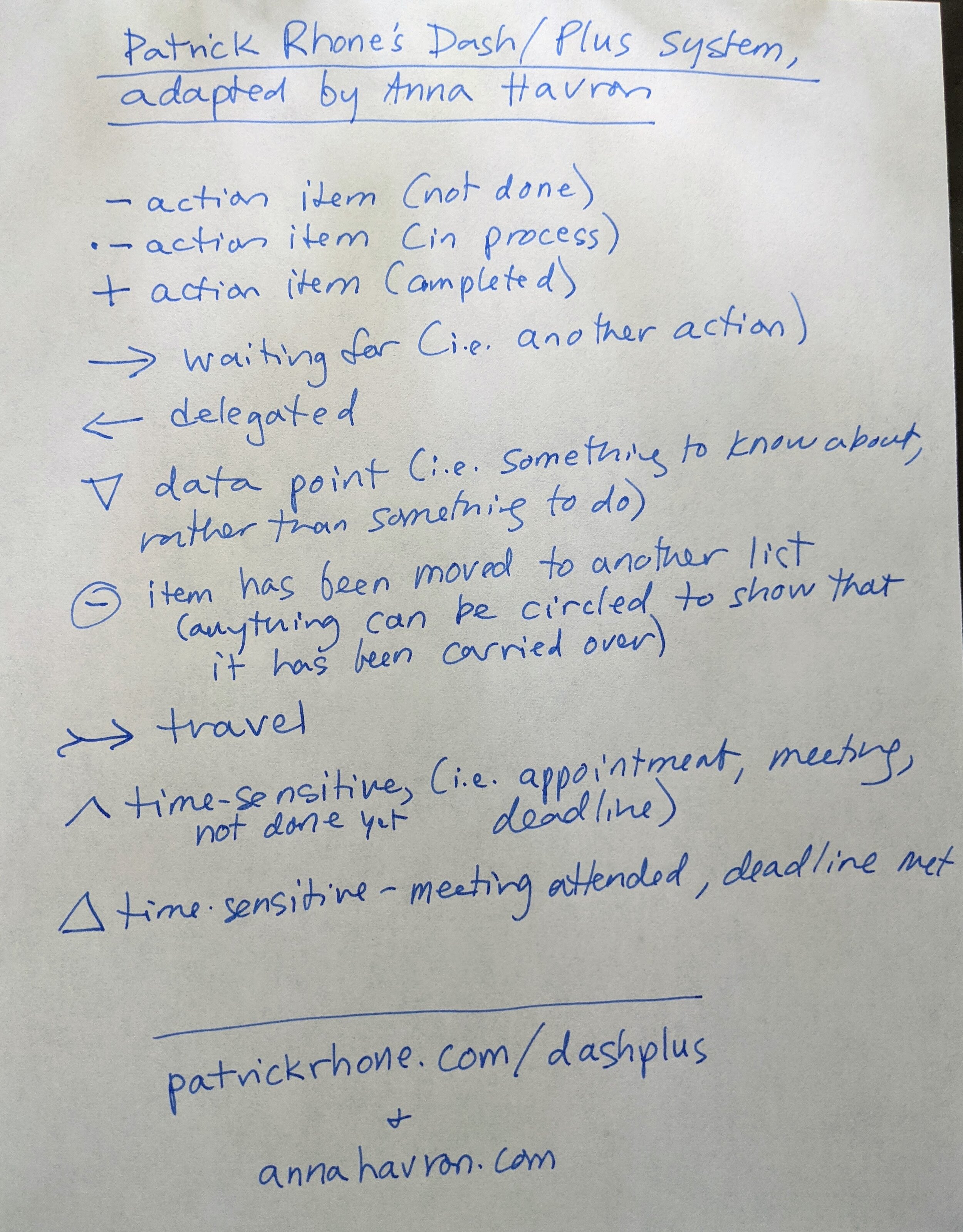 Since then, however, I switched to a set of symbols that works better for me, because it is easier for me to see them at a glance. Here’s my adaptation of Patrick Rhone’s elegant Dash/Plus system. (I sacrificed some of the elegance of using dashes as the baseline for everything. I wanted to keep using my old symbol for meetings, which looks like a caret ^ when I haven’t yet attended them, and looks like a triangle when I have.)